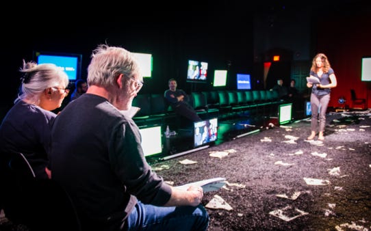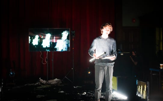 In the Boston presentations of “JUST TELL NO ONE” in Lincoln Center, the video was redesigned to a three channel, multiple monitor set incorporating live camera and effects.