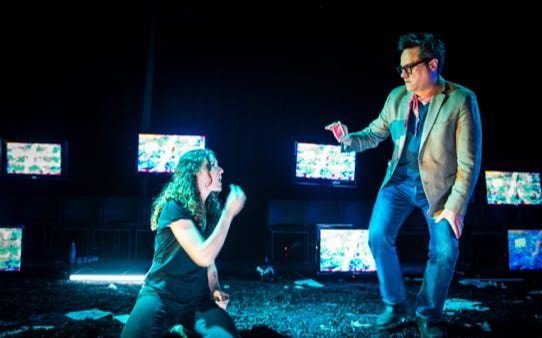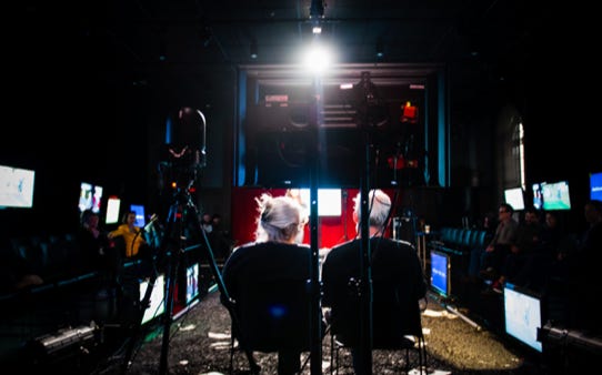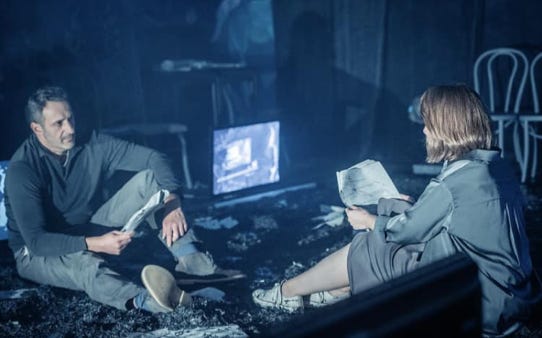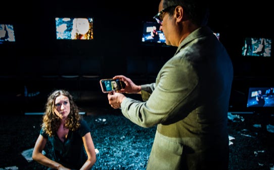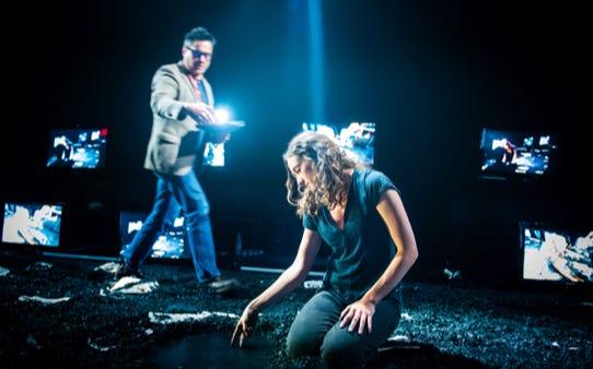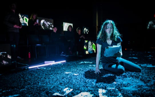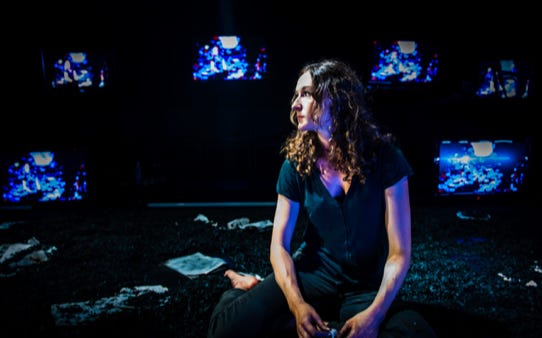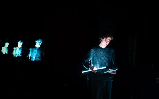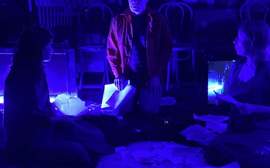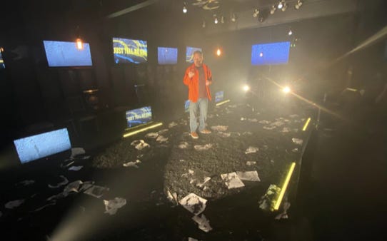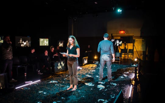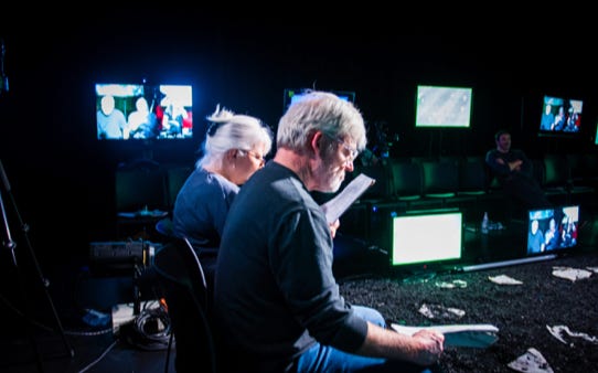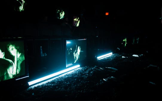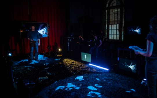 In the Boston presentations of “JUST TELL NO ONE” in Lincoln Center, the video was redesigned to a three channel, multiple monitor set incorporating live camera and effects.